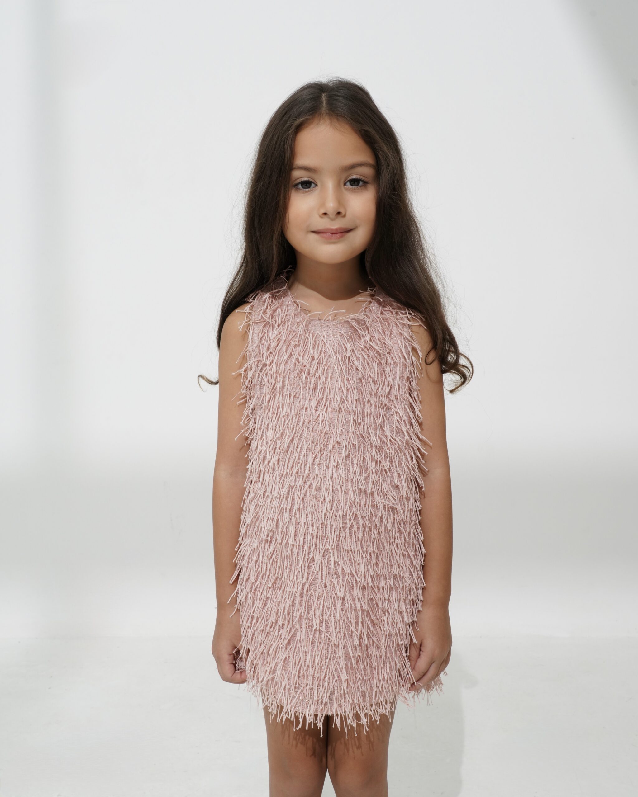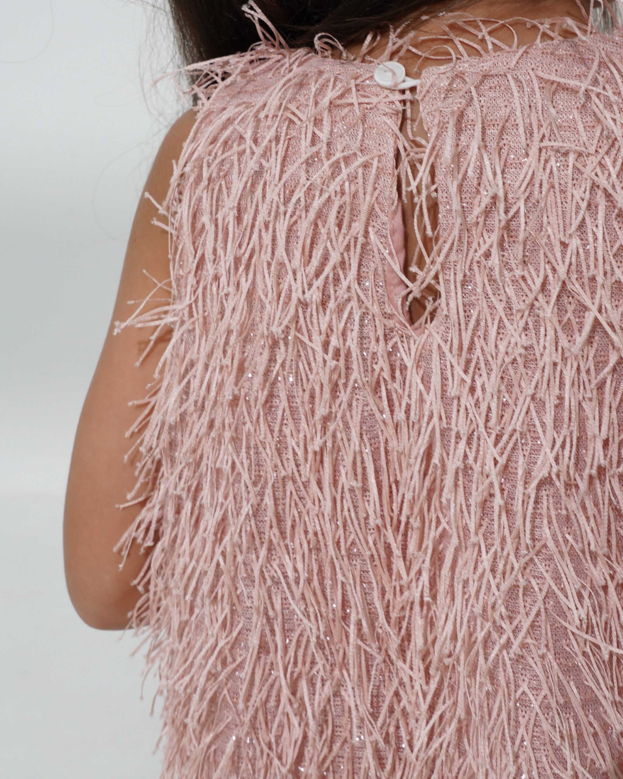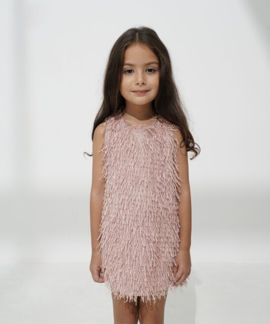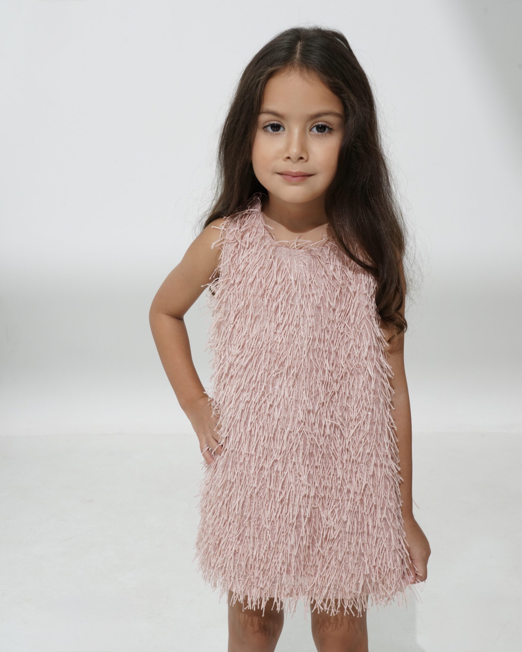 Make your little girl’s special moments sparkle with this enchanting fringe dress. Designed with layers of shimmering tassels that catch the light beautifully, this dress brings a magical touch to every twirl. The soft inner lining is made from breathable cotton to keep her comfortable throughout the day, while the outer shimmer adds a touch of glam perfect for parties, celebrations, and photo moments.