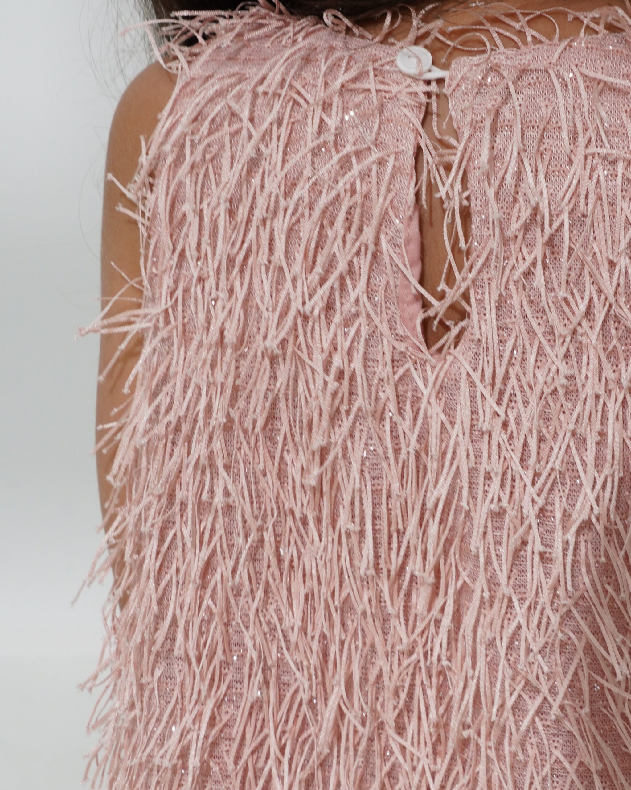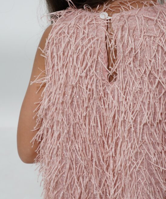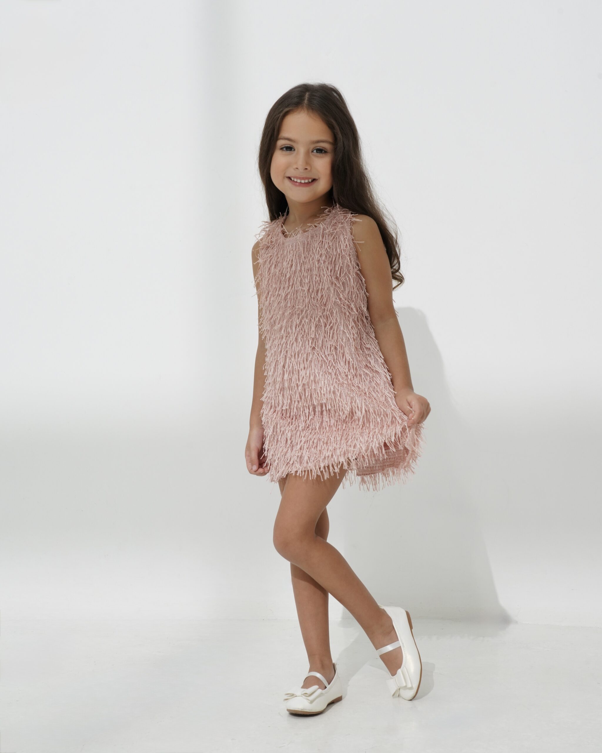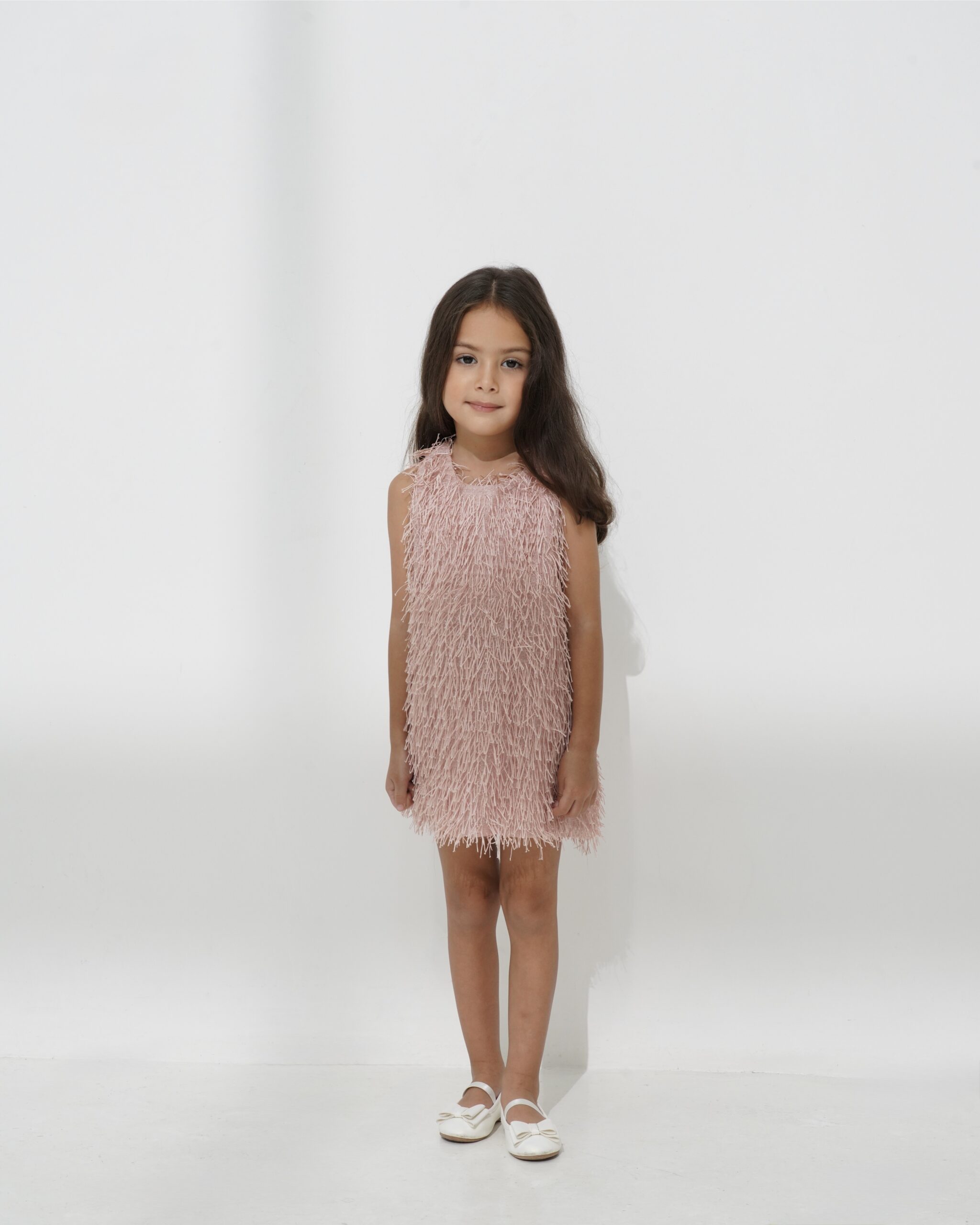Make your little girl’s special moments sparkle with this enchanting fringe dress. Designed with layers of shimmering tassels that catch the light beautifully, this dress brings a magical touch to every twirl. The soft inner lining is made from breathable cotton to keep her comfortable throughout the day, while the outer shimmer adds a touch of glam perfect for parties, celebrations, and photo moments.