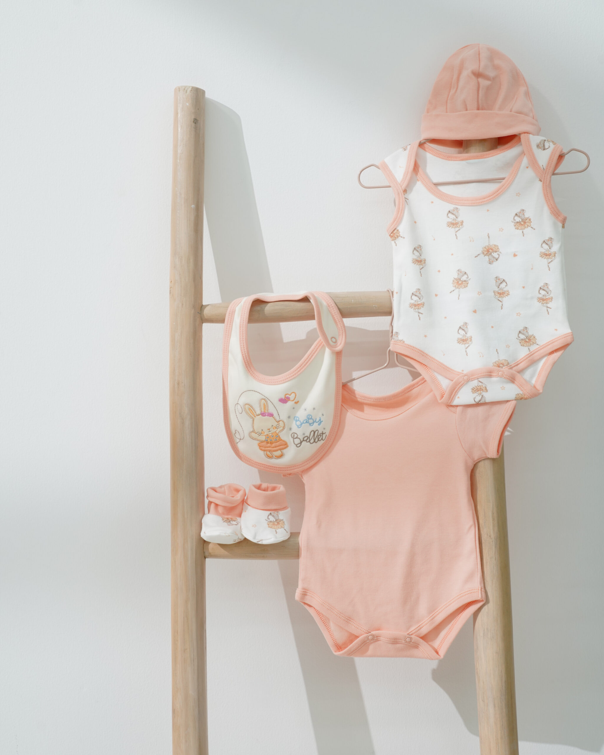 Wrap your little one in softness and charm with our 100% cotton newborn set, specially designed for ultimate comfort and style. This 7-piece set features adorable ballerina and bunny prints in soft peach and cream tones — perfect for baby girls 0–3 months.